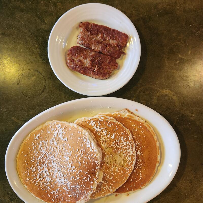 Breakfast Meat Choices: Applewood Bacon, Sausage, Livermush.