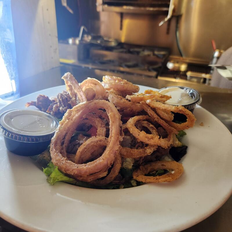 On a bed of Mixed Greens with choice of dressing: Fat Free Italian, Garlic Ranch, Blue Cheese, Honey Mustard, Balsamic Vinaigrette Extra Dressings +$0.50